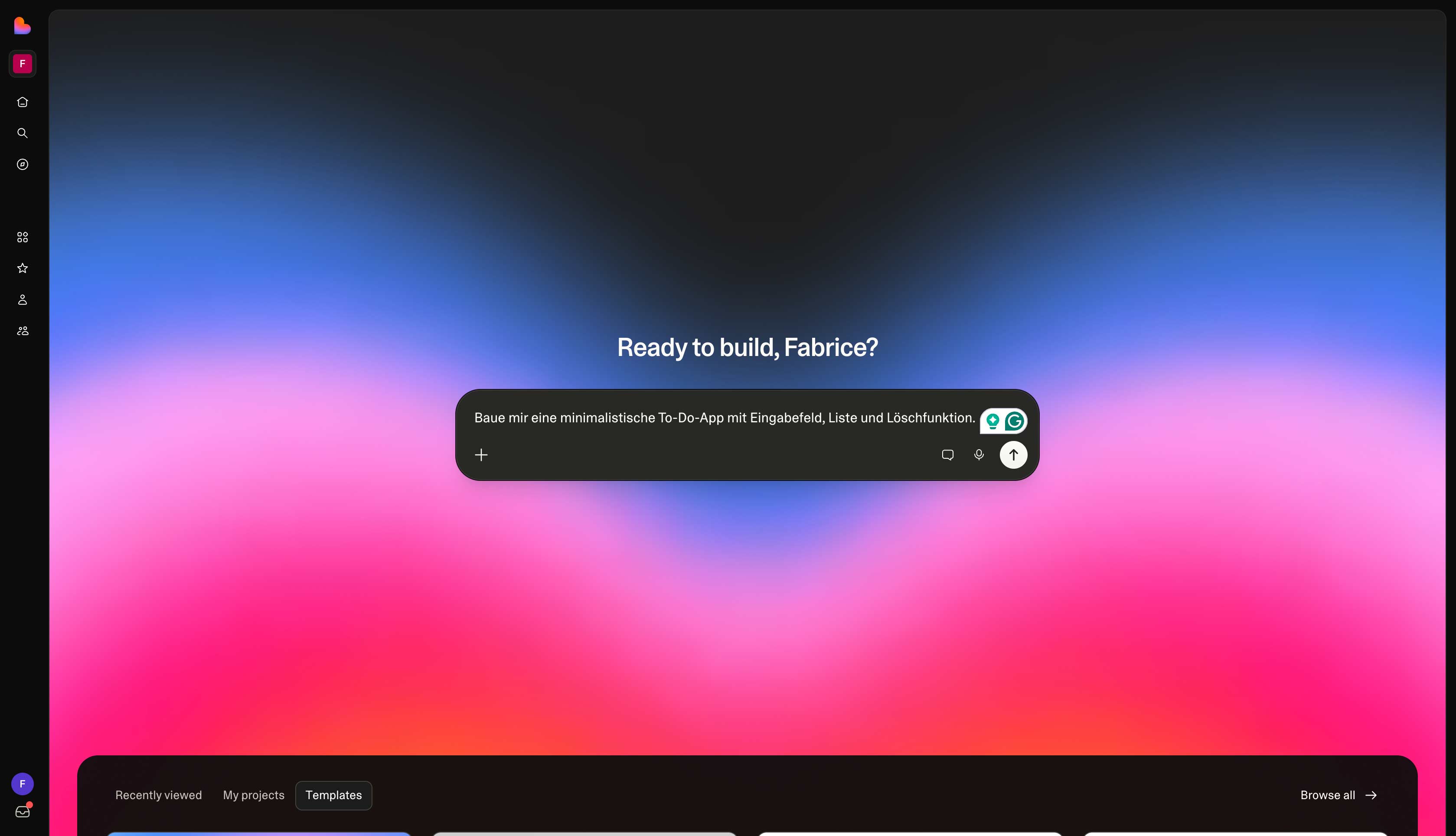 Bolt ist die richtige Wahl, wenn Geschwindigkeit oberste Priorität hat. Die Browser-basierte Vibe Coding Software benötigt keine Installation und erzeugt in unabhängigen Tests die schnellsten Prototypen – typischerweise in unter 30 Minuten. Ideal für Hackathons, Demos und die erste Validierung einer Idee, bevor man mehr Zeit investiert.