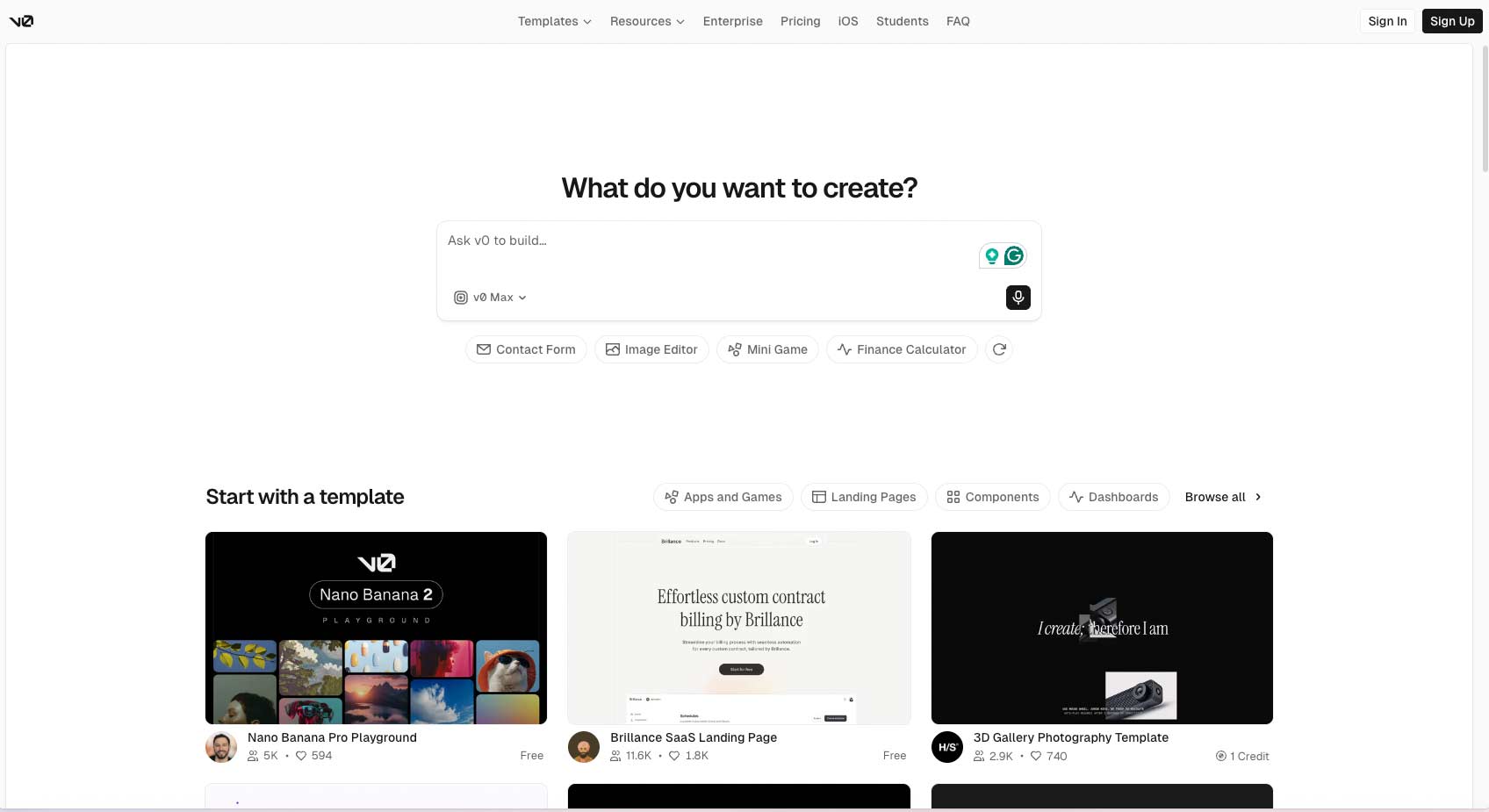 v0 ist ein KI-Tool von Vercel, das sich ausschließlich auf die Generierung von Frontend-Interfaces spezialisiert hat. Aus einem Textprompt oder einem Figma-Import entstehen sofort einsatzbereite React-Komponenten in hoher Qualität. v0 hat keinen eigenen App-Builder – es ist ein reines UI-Tool, das perfekt in bestehende Entwicklungsprojekte integriert werden kann.